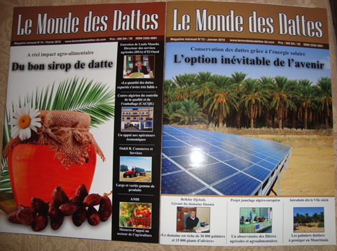 Le magazine ‘’Le Monde des Dattes’’ entame l’année 2015 avec deux nouveaux numéros, les n°13 (janvier) et n°14 (février) aussi riches qu’intéressants. Les deux numéros sont disponibles au niveau du centre de documentation du BNEDER-siège.Dans le numéro 13, vous pouvez lire :