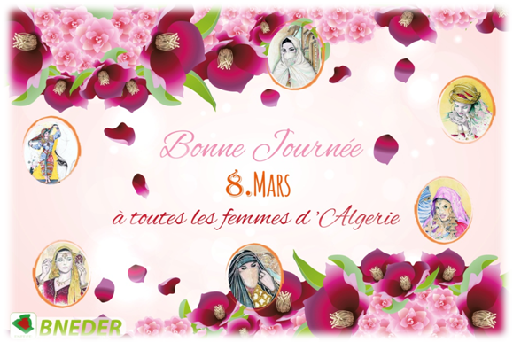 La Direction Générale du BNEDER présente à l'ensemble du personnel féminin de l'établissement et à toutes les femmes algériennes ses meilleurs vœux de bonheur, de prospérité et de réussites à l'occasion de la célébration de la journée internationale des droits de la femme qui coïncide avec le 8 mars de chaque année.