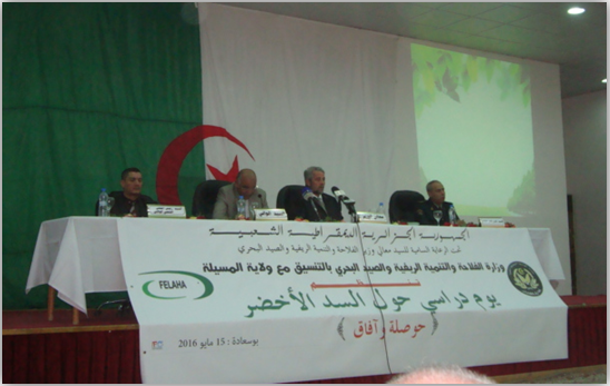 Le Ministère de l’Agriculture, du Développement Rural et de la Pêche (MADRP), à travers la Direction Générale des Forêts (DGF), a organisé, le dimanche 15 mai 2016 à l’Institut Technique de l’Hôtellerie de Boussaâda, dans la wilaya de M’sila, une journée d’étude sur le barrage vert sous le thème : ‘’Bilan et perspectives’’.