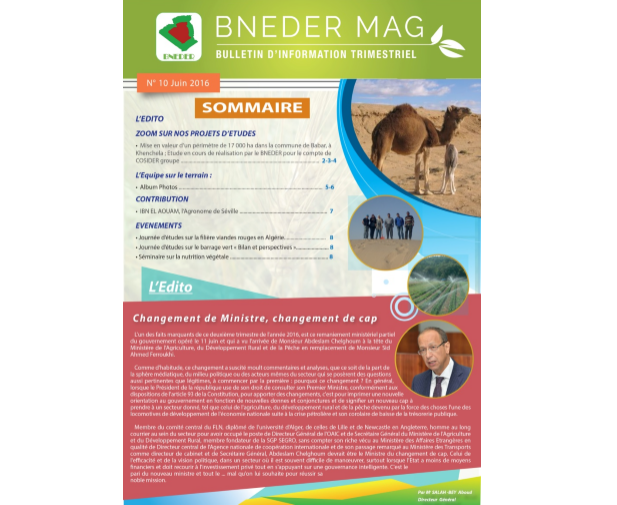 MAG BNEDER, le bulletin d'information trimestriel du BNEDER vient de souffler modestement sa dixième bougie avec un numéro consacré aux principaux événements et activités de l'établissement durant le deuxième trimestre 2016 qui a connu vers sa fin un changement à la tête du Ministère de l'Agriculture, du Développement Rural et de la Pêche (MADRP) avec l'arrivée de Monsieur Chelghoum Abdeslam, en remplacement de Monsieur Ferroukhi Sid Ahmed.