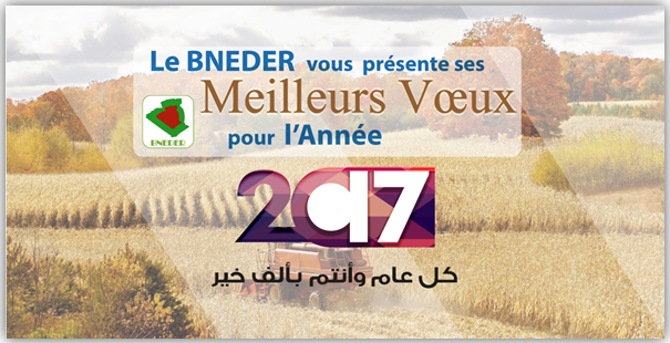 A l’occasion de la nouvelle année 2017, la Direction Générale du BNEDER présente à l’ensemble du personnel, à tous ses partenaires et à tous les acteurs du secteur de l’Agriculture, du Développement Rural et de la Pêche ainsi qu’à tous les algériens ses meilleurs vœux de bonheur, de bonne santé et de réussites dans tous les domaines.
