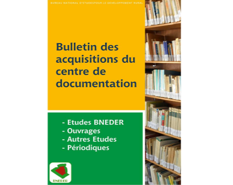 Le Centre de Documentation du BNEDER informe l’ensemble des cadres techniques du siège ainsi que ceux des Bureaux de Liaison de la disponibilité, depuis le mois de janvier 2017, des rapports d’études BNEDER et autres études (ouvrages et périodiques), et dont vous trouverez ci-après les titres et les références :...(Etudes BNEDER...)