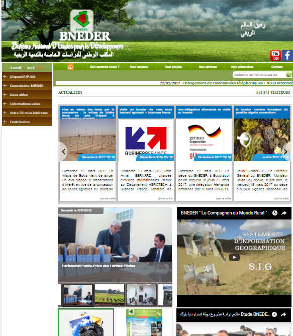 Aujourd’hui, avec plus de 550 000 visiteurs, le site web du BNEDER est considéré comme une source de référence en matière d’information et de vulgarisation, et ce, par un bon nombre de consultants, bureaux d’études, agriculteurs et autres internautes également.