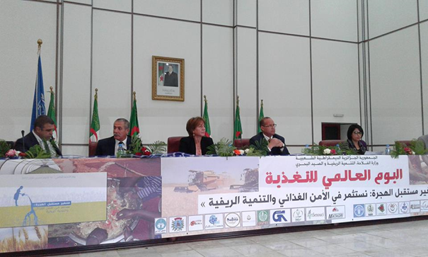 Le Ministre de l’Agriculture, du Développement Rural et de la Pêche, Monsieur Abdelkader Bouazgui, a présidé, lundi 16 octobre 2017 à l’université Abdelhamid Ibn Badis de Mostaganem la double célébration de la Journée Mondiale de l’Alimentation (JMA) et de la Journée Nationale de la Vulgarisation Agricole (JNVA), en présence de Mmes Ghania Eddalia, Ministre de la Solidarité Nationale, de la Famille et de la Condition de la Famille, et de Fatima-Zohra Zerouati, Ministre de l’Environnement et des Energies Renouvelables, mais également de Monsieur Rabhi Mohamed Abdenour, wali de Mostaganem et de Monsieur Nabil Assaf, représentant de la FAO à Alger.
