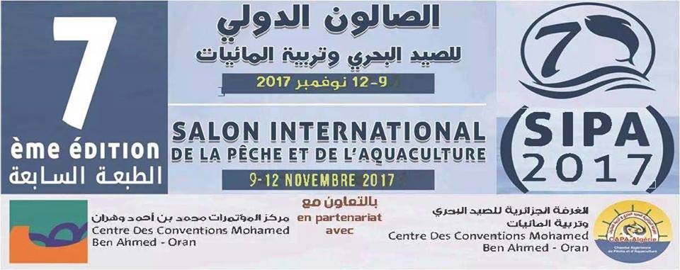 Sous le haut patronage de Son Excellence le Président de la République Monsieur ABDELAZIZ BOUTEFLIKA, la Chambre Algérienne de la Pêche et de l’Aquaculture (CAPA), en partenariat avec le Centre de Conventions Mohamed Ben Ahmed d’Oran, organise la septième édition du Salon International de la Pêche et de l’Aquaculture (SIPA’2017) du 09 au 12 novembre 2017 sous le slogan :
