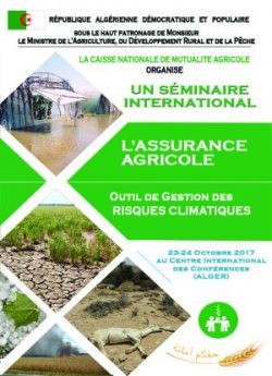 Sous le haut patronage de Monsieur Abdelkader BOUAZGUI, Ministre de l’Agriculture, du Développement Rural et de la Pêche, la Caisse Nationale de Mutualité Agricole « CNMA » organise un Séminaire International portant le thème : ‘’l’Assurance Agricole, outil de gestion des risques climatiques’’ et ce, les Lundi et Mardi 23/24 Octobre 2017 à Alger au niveau du Centre International des Conférences (C.I.C) – salle des conférences à partir de 08h30.