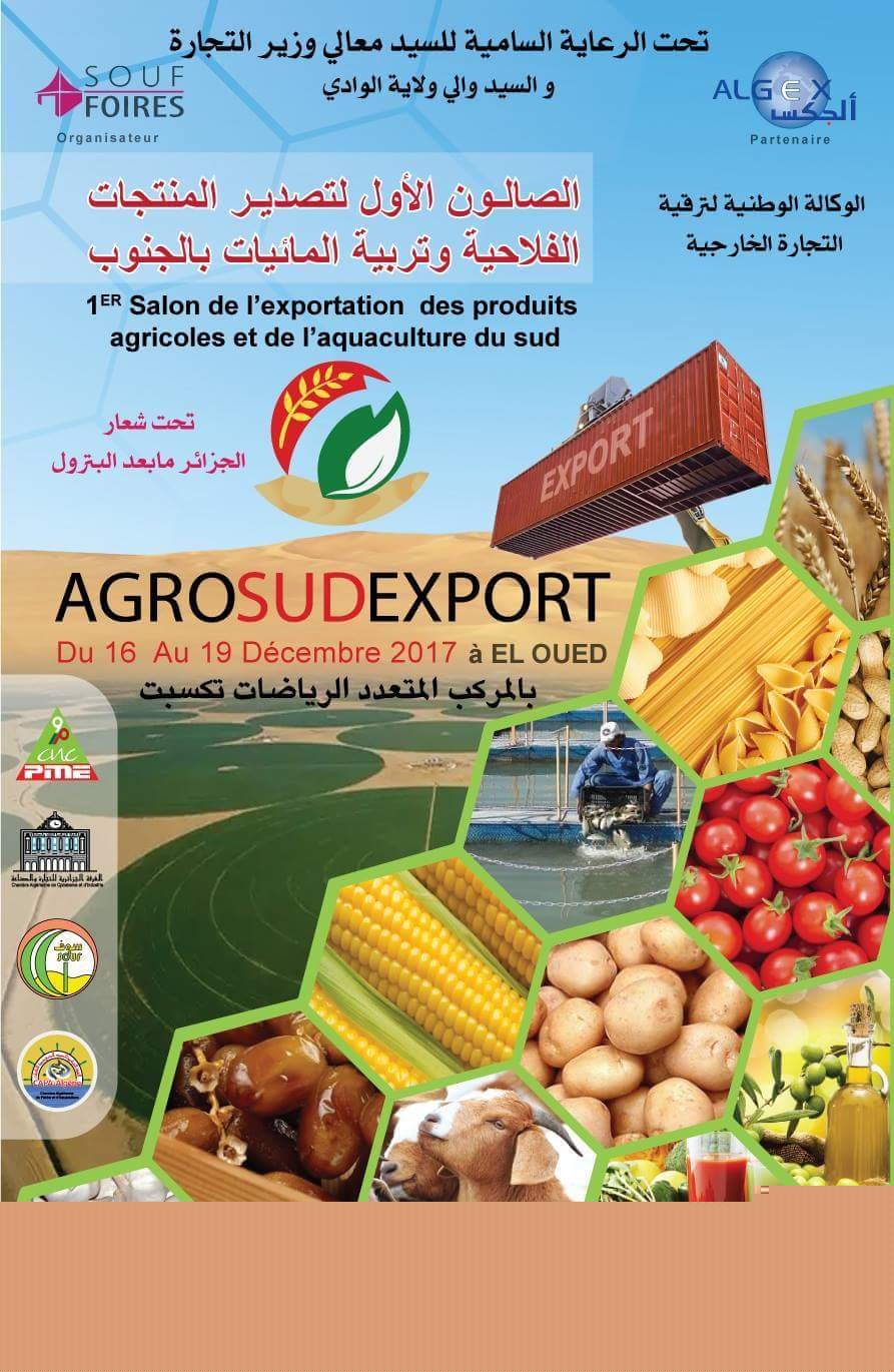 ALGEX vous informe de la tenue du salon « Agro Sud Export », 1erSalon de l’Exportation des Produits Agricoles et l’Aquaculture du Sud, qui se tiendra du 16 au 19 Décembre 2017 au Complexe Sportif Omnisports «TAKSEBT» à d'El Oued (Algérie).