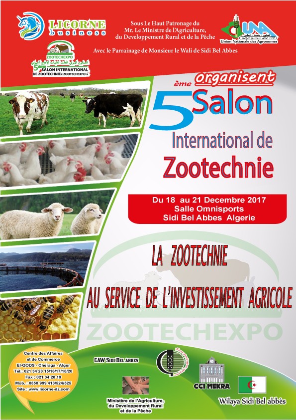 Placé sous le thème «LA ZOOTECHNIE AU SERVICE DE L’INVESTISSEMENT AGRICOLE », le 5èmeSalon International de Zootechnie « ZOOTECH EXPO » sera tenu dans la Wilaya de Sidi Bel Abbes du 18 au 21 Décembre 2017.