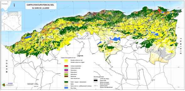 L’élaboration de la carte d’occupation du sol du Nord de l’Algérie à l’échelle contractuelle du 1/50 000° (avec une précision de travail du 1/25 000°) repose sur le traitement des images satellitaires et des vérifications de terrain. Dans le document remis à l’INSID, on y trouve entre autres la présentation de la zone d’étude (Nord Algérie), la méthodologie adaptée pour la cartographie de la carte d’occupation, les nomenclatures, les différentes étapes de la réalisation, et tout particulièrement l’occupation agricole, sa répartition spatiale au niveau du territoire et en dernier les résultats statistiques issus de la cartographie à partir de l’imagerie satellites.
