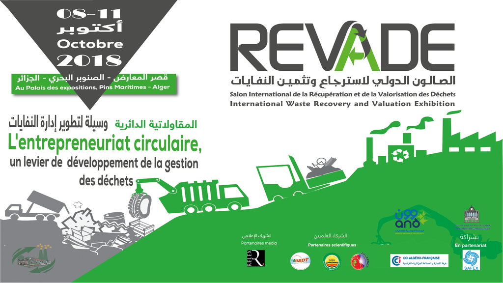 La Chambre Algérienne de Commerce et d'Industrie (CACI) organise en collaboration avec l'Agence Nationale des Déchets (AND) la 3ème édition du ''Salon International de la Récupération et de la Valorisation des Déchets REVADE'' du 08 au 11 octobre 2018 au Palais des Expositions des Pins Maritimes, à Alger, sous le thème : ''l'entreprenariat circulaire, un levier de développement de la gestion des déchets''.