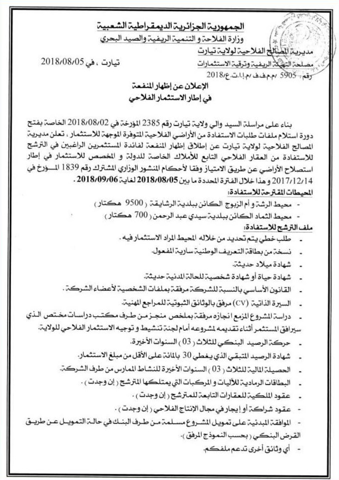 La période consacrée à cet appel se situe entre le 05 août et le 06 septembre 2018 au cours de laquelle les candidats intéressés devront déposer leur dossier (voir l’annonce et les pièces à fournir) au niveau de la Direction des Services Agricoles (DSA) de Tiaret.