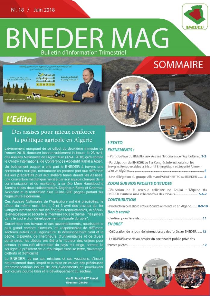 Le n°18 (juin 2018) du bulletin d’information trimestriel BNEDER MAG a fait sa parution avec comme sujet principal : retour sur la participation du BNEDER aux Assises Nationales de l’Agriculture qui ont été tenues le 23 avril dernier au Centre International de Conférences (CIC) Abdelatif Rahal, à Alger.