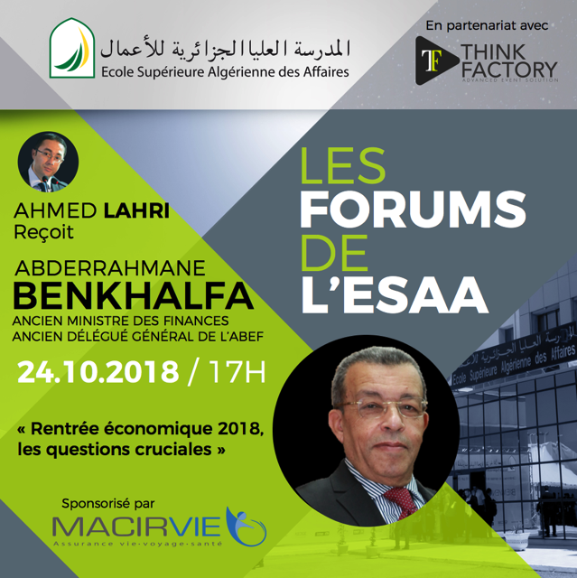 L'école Supérieure Algérienne des Affaires (ESAA) organise le mercredi 24 octobre 2018 au niveau de son siège, son tout premier FORUM de l'année, sous le thème" Rentrée économique 2018,les questions cruciales ".