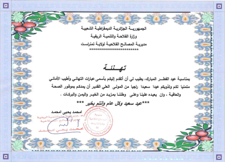 A l’occasion de la fête de l’Aïd El-fitr El-Moubarek, la Direction Générale et l’ensemble du personnel du BNEDER tiennent à remercier tous ceux qui leur ont exprimé leur sympathie et transmis leur vœux, renforçant ainsi les liens entre notre institution et l’ensemble de ses partenaires.