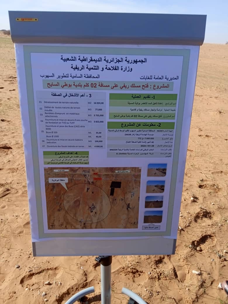 Posté par admin le 31-01-2024Les journées du 29-30 janvier 2024 le BNEDER représenté par Mr Barkat Ahmed chargé du suivi des projets d’exécution du Barrage Vert, a participé en compagnie des autorités locales, des cadres de la DSA et ceux du HCDS de la wilaya de M’sila aux lancements des chantiers pour la réalisation des pistes agricoles et rurales :