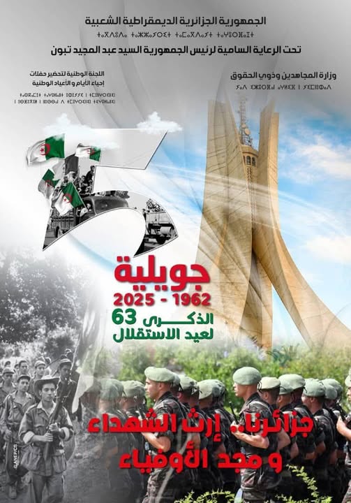 Previous Next 63e anniversaire de l'Independence Posté par admin le 03-07-2025 الذكرى 63 لعيد الاستقلال الوطني Événement Partager: