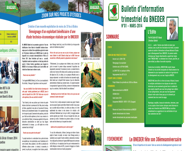 Tant bien que mal, ‘’BNEDER MAG’’, le premier bulletin d’information du Bureau National d’Etudes pour le Développement Rural, vient de paraitre. Malgré quelques soucis d’imprimerie et surtout l’absence de l’infographe Ayad Amine, à qui nous souhaitons un prompt rétablissement, la première publication d’information de notre établissement a vu le jour.Il s’agit d’un bulletin trimestriel qui revient régulièrement sur toutes les activités marquantes de l’établissement et les événements les plus importants du secteur de l’agriculture et du développement rural.