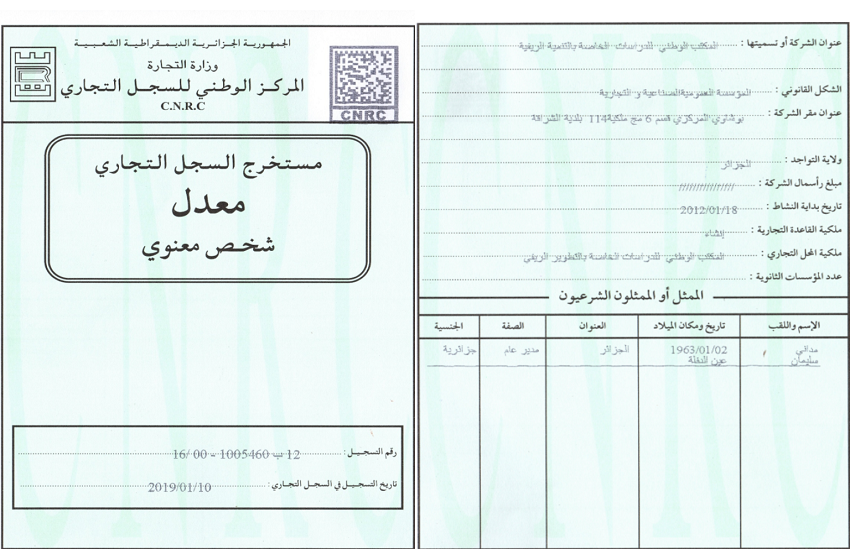 Ainsi, suite à la nomination d’un nouveau dirigent de l’EPIC BNEDER, il a été procédé à une formalité modificative au Registre, en ajoutant le nom de son représentant légal à savoir ; Monsieur MEDANI Slimane en tant que Directeur Général du Bureau National d’Etudes pour le Développement Rural (BNEDER).