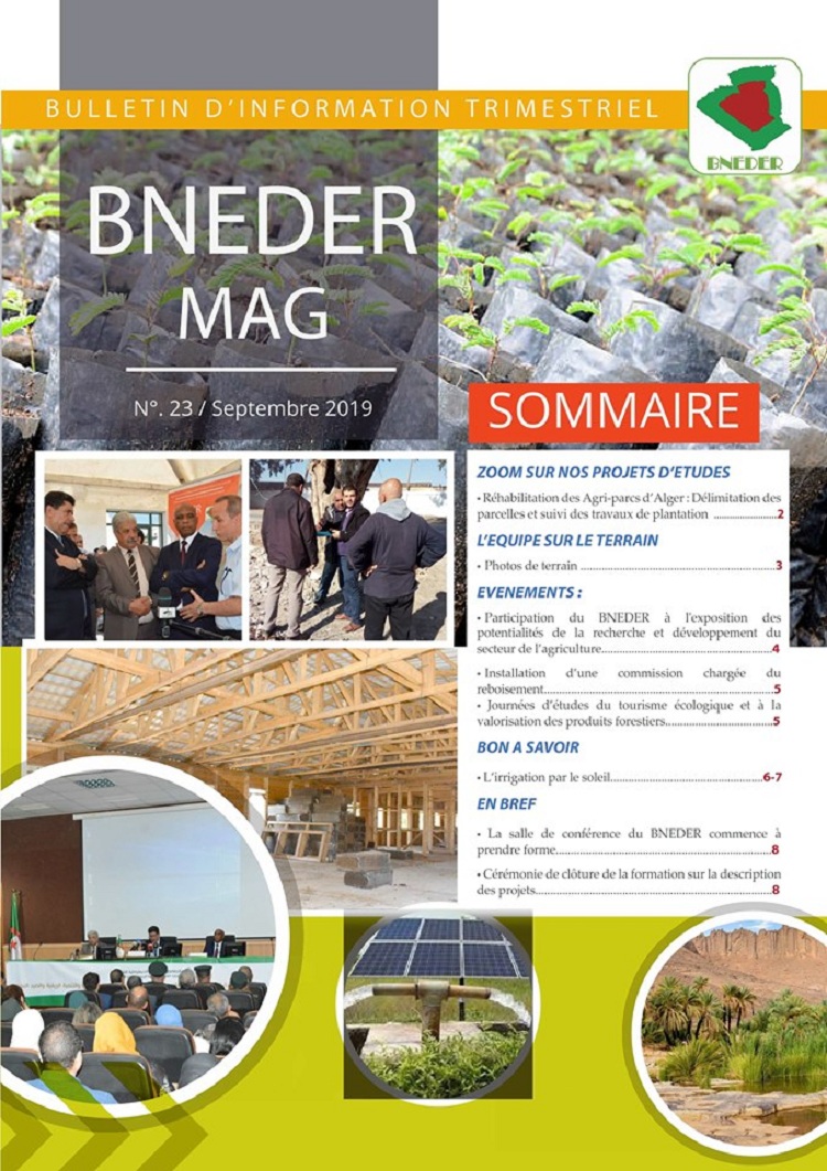 Posté par admin le 18-11-2019Le bulletin d'information trimestriel du BNEDER, "BNEDER MAG", est déjà à son 23e numéro paru le mois de septembre 2019. Au sommaire de cette nouvelle édition consacrée notamment aux principaux événements et activités de l'établissement durant le troisième trimestre 2019, on peut lire ce qui suit :