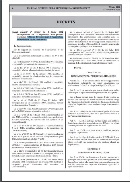 Posté par admin le 13-10-2020Décret exécutif 20-265 portant sur la création de l’Office de développement de l’agriculture industrielle en terres sahariennes « O.D.A.S »