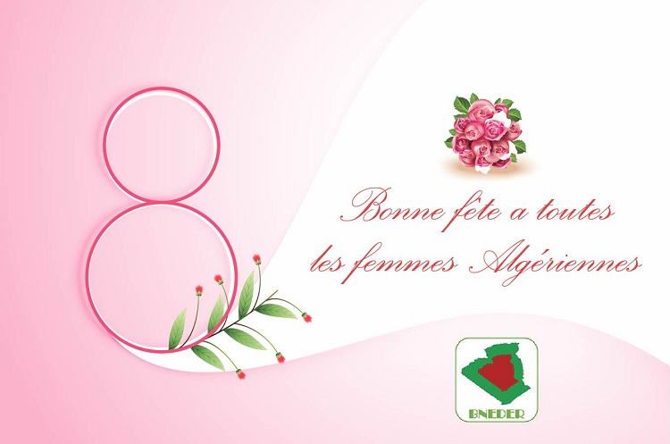 Posté par admin le 08-03-2021A l’occasion de la célébration du 8 mars, Journée Internationale de la Femme, la Direction Générale, présente à toutes les femmes travailleuses du BNEDER, ainsi que toute les femmes algériennes, ses meilleurs vœux de bonne santé, de paix, de réussite et de prospérité.