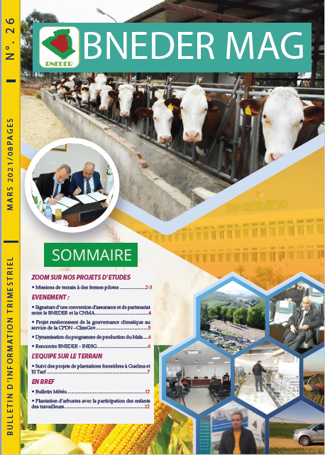 Quant à la rubrique "Evènement", retour sur divers évènements qui ont eu lieu pendant cette période et auxquels le BNEDER avait pris part, à savoir la signature d’une convention d'assurance et de partenariat entre le BNEDER et la CNMA. La rencontre BNEDER – INESG. La conférence sur le projet renforcement de la gouvernance climatique. Aussi, la participation du BNEDER à un atelier sur la dynamisation du programme de production du Maïs.