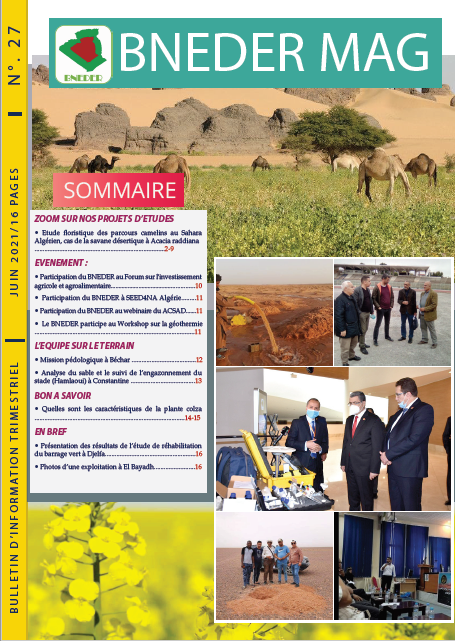Posté par admin le 13-09-2021Le bulletin d'information trimestriel "BNEDER MAG", N°27 vient de paraitre avec une contribution pertinente de Mme CHIKIROU Cadre Ecologiste sur l’étude floristique des parcours camelins au Sahara Algérien, cas de la savane désertique à Acacia raddiana. Elle revient dans son rapport avec beaucoup de détails et de statistiques sur les différentes espèces, et l’importance de ce couvert végétal sur le développement du dromadaire et les conséquences de sa dégradation sur la biodiversité saharienne.