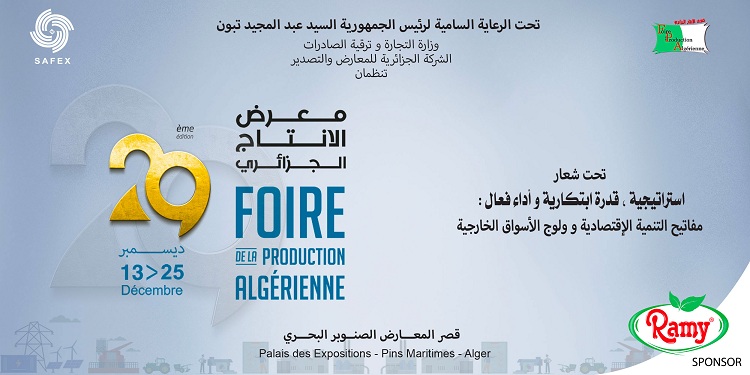 Pour rappel, la 29ème édition de la Foire de la production algérienne(FPA) qui se tient jusqu'au 25 décembre courant, au Palais des expositions (Pins-maritimes) à Alger, est organisée par le Ministère du Commerce et de la Promotion des Exportations et la Société algérienne des foires et exportations (Safex).