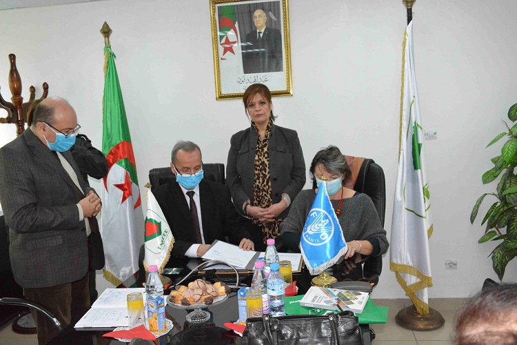 Posté par admin le 21-12-2021Le BNEDER et la FAO ont signé lundi 20 décembre 2021, un contrat ayant pour objet, la réalisation d’une étude de faisabilité pour la proposition de financement du projet relatif à «l’Amélioration de la résilience climatique dans les steppes et les zones de forêts sèche du barrage vert algérien ». Ce contrat a été signé par Monsieur Khaled BENMOHAMED Directeur Général du Bureau National d’Etudes pour le Développement Rural (BNEDER), et Madame Irina BUTTOUD représentante de la l’Organisation des Nations unies pour l’Alimentation et l’Agriculture (FAO) en Algérie, et ce, en présence des cadres et représentants de la Direction Générale des Forêts (DGF). La cérémonie de signature s’est déroulée au siège du BNEDER sis à Bouchaoui, à Alger.