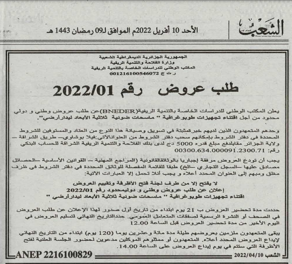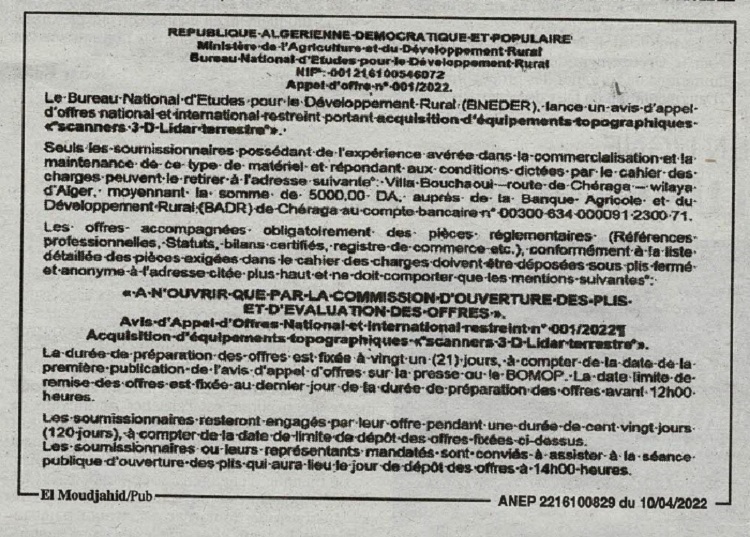 Posté par admin le 10-04-2022Dans le cadre de la mise en œuvre de ses projets d’études notamment en matière de la télédétection et traitement des images satellitaires. Le Bureau National d’Etudes pour le Développement Rural (BNEDER), a lancé le 10/04/2022, via la presse (El Moujahid - El Chaâb), et le BOMOP un appel national et international restreint portant " acquisition d’équipements topographiques" scanners 3D-Lidar terrestre".