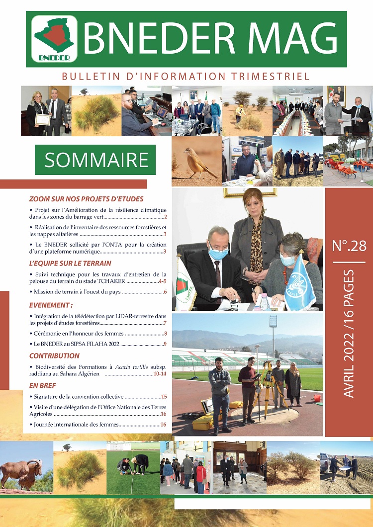 Posté par admin le 27-04-2022Le premier bulletin trimestriel de l’année 2022 (BNEDER MAG-N°28), vient de paraitre avec une panoplie de sujets intéressants consacrés notamment aux principales activités de l'établissement durant cette période, cette nouvelle édition est disponible et téléchargeable sur notre site web. On peut lire au sommaire de ce nouveau numéro ce qui suit :