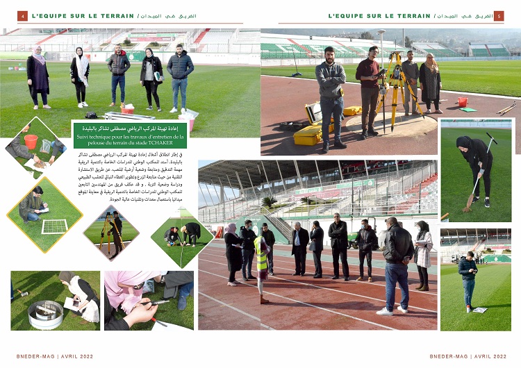 Par ailleurs, la rubrique l’équipe sur le terrain revient en images, sur les missions de terrain à l’ouest du pays effectuées par l’équipe technique de BNEDER-Oran. Aussi, la mission sur le suivi technique pour les travaux d’entretien de la pelouse du terrain du stade TCHAKER à Blida.