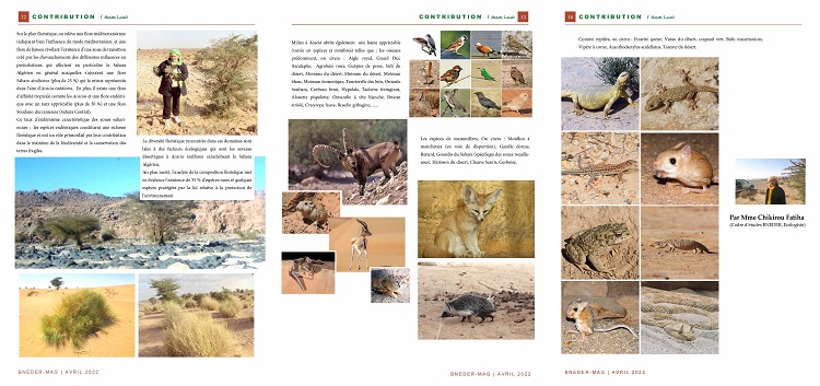 Enfin, vous trouverez dans cette édition une pertinente contribution de Mme CHIKIROU Fatiha cadre d’études et écologiste, intitulée "la biodiversité des formations à Acacia tortilis subsp. raddiana au Sahara Algérien". Cette étude met en lumière la diversité floristique patrimoniale de la flore du Sahara et sa conservation face aux aléas climatiques.