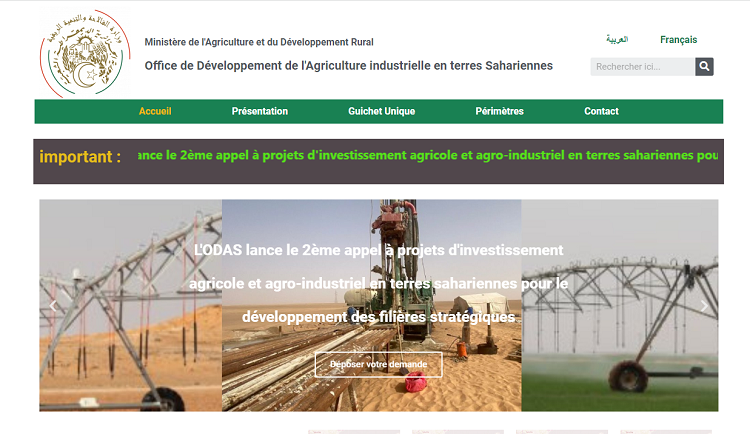 L’Office de Développement de l'Agriculture industrielle en terres Sahariennes (ODAS), vient de lancer via son site web, le 2e appel à projets d'investissement agricole et agro-industriel en terres sahariennes pour le développement des filières stratégiques ". Ainsi, les porteurs de projets intéressés par l’investissement agricole et agro-industriel en terres sahariennes sont invités à soumissionner à travers la plateforme de l’ODAS. Plusieurs périmètres sont concernés notamment à Hassi Massaoud, Ghardaïa, Touggourt, El Menea, et Ouargla.