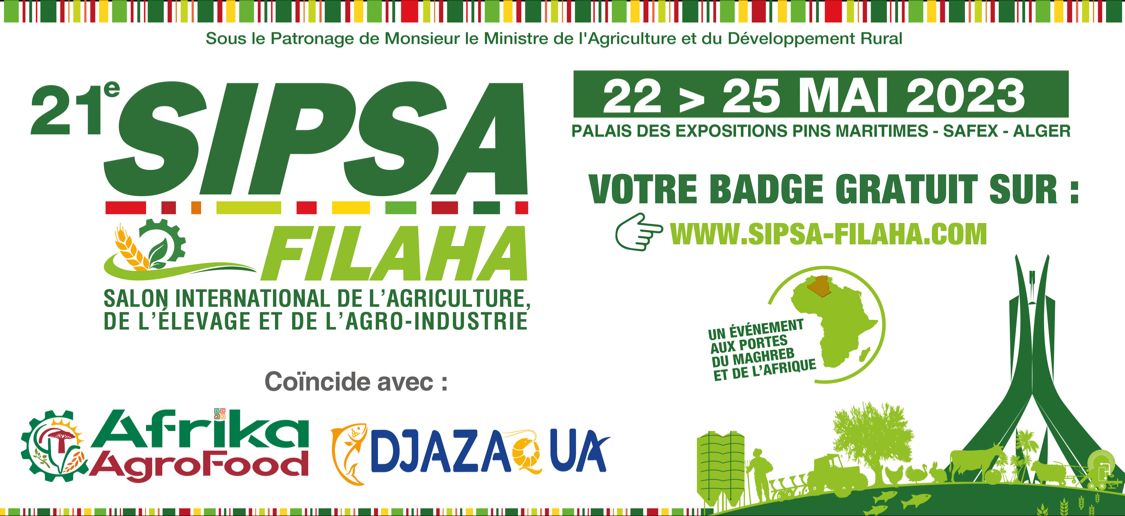 Le Bureau National d’Etudes pour le Développement Rural (BNEDER), prendra part au Salon International de l’Agriculture, de l’Elevage et de l’Agro-industrie (SIPSA-FILAHA), qui se tiendra du 22 au 25 mai 2023, au Palais des Expositions SAFEX, Alger.