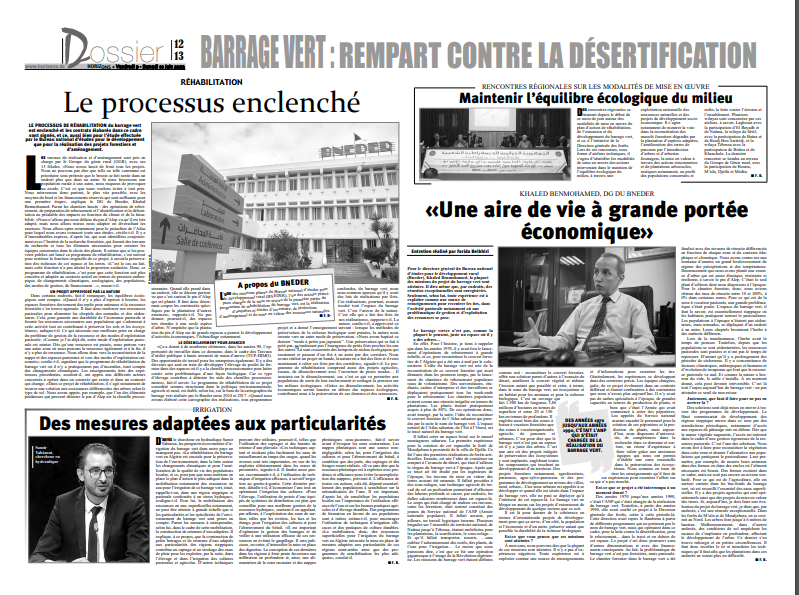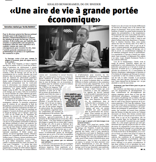 Posté par admin le 13-06-2023Vous retrouvez une interview exclusive de Monsieur BENMOHAMED Khaled Directeur Général du Bureau National d’Etudes pour le Développement Rural (BNEDER) accordée au journal Horizons qui a consacré tout un dossier sur le projet du barrage vert sous le titre « Barrage vert, rempart contre la désertification ».