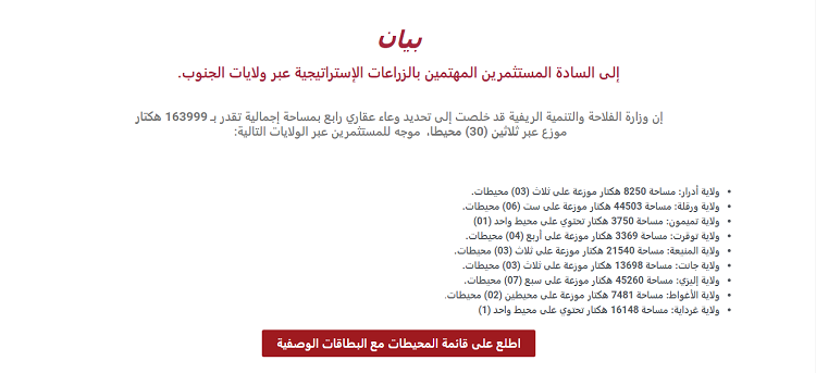 Avis d’Appel aux Investisseurs intéressés par l'agriculture stratégique dans les wilayas du sud :