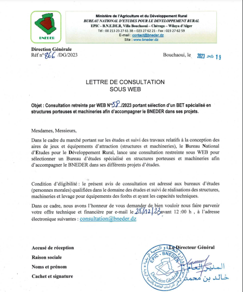 Posté par admin le 19-12-2023Le Bureau National d’Etudes pour le Développement Rural (BNEDER) vient de lancer via son site web, une consultation restreinte portant sur la sélection d'un Bureau d’études spécialisé en structures porteuses et machineries afin de d’accompagner le BNEDER dans ses différents projets d’études.