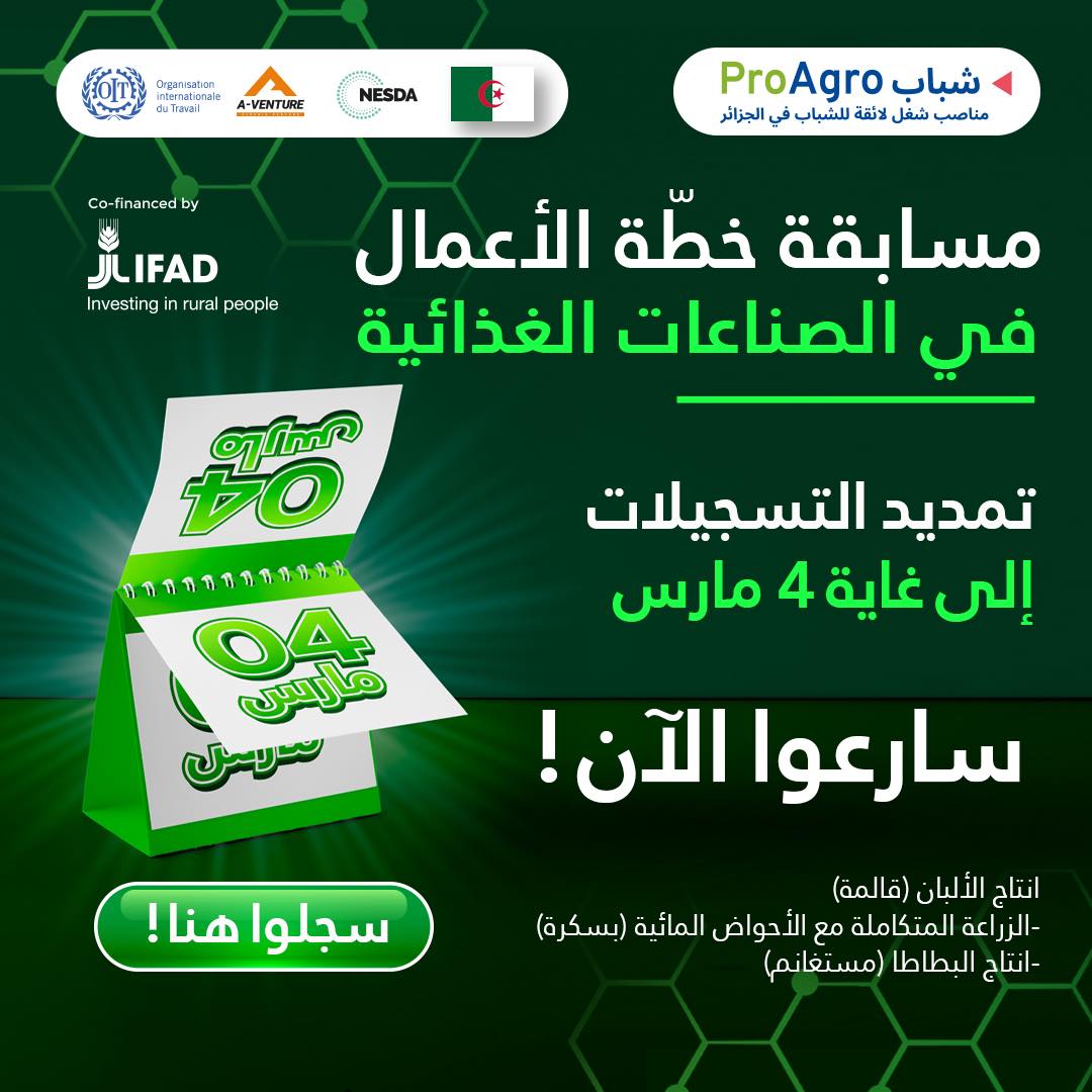 « Si vous êtes un jeune entrepreneur avec des idées d'expansion ou porteur de projet, vivant à Mostaganem, Biskra ou Guelma et que vous cherchez à améliorer votre business plan ? C'est ta chance ! Soumettez vos idées pour développer vos projets ou démarrer de nouvelles entreprises ». Algeria Venture, invite donc les porteurs de projets dans ces domaines désirant réaliser leurs rêves et concrétiser leurs objectifs à soumettre leurs candidatures via la plateforme dédiée et dont le délai est fixé au 14 mars 2024. Il est important de rappeler, que le BNEDER avait été chargé dans le « projet ProAgro Jeunes » d’analyser des chaines de valeur au niveau desdites wilayas.