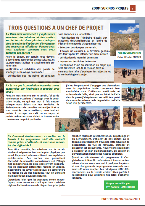 Dans la rubrique "Zoom sur nos projets", nous nous sommes focalisés avec quelques détails sur le projet de "l'inventaire alfatier au niveau des espaces steppiques et agro-pastoraux". Vous y trouverez une interview intéressante avec la chef de projet qui nous explique le programme des missions sur le terrain.