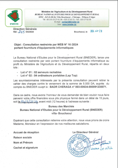 Posté par admin le 29-02-2024Le Bureau National d’Etudes pour le Développement Rural (BNEDER) lance une consultation restreinte sous web portant fourniture d’équipements informatique ( serveurs/ Ordinateurs portables).