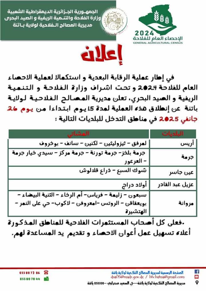 Posté par admin le 26-01-2025L'enquête post-censitaire du Recensement Général de l'Agriculture (RGA) 2024 a été officiellement lancée ce dimanche 26 janvier 2025, couvrant 28 wilayas. Cette opération, qui se poursuivra jusqu'au 9 février 2025, a pour objectif de vérifier l'exactitude et la fiabilité des données collectées lors du RGA 2024, tout en assurant une qualité optimale des statistiques agricoles.