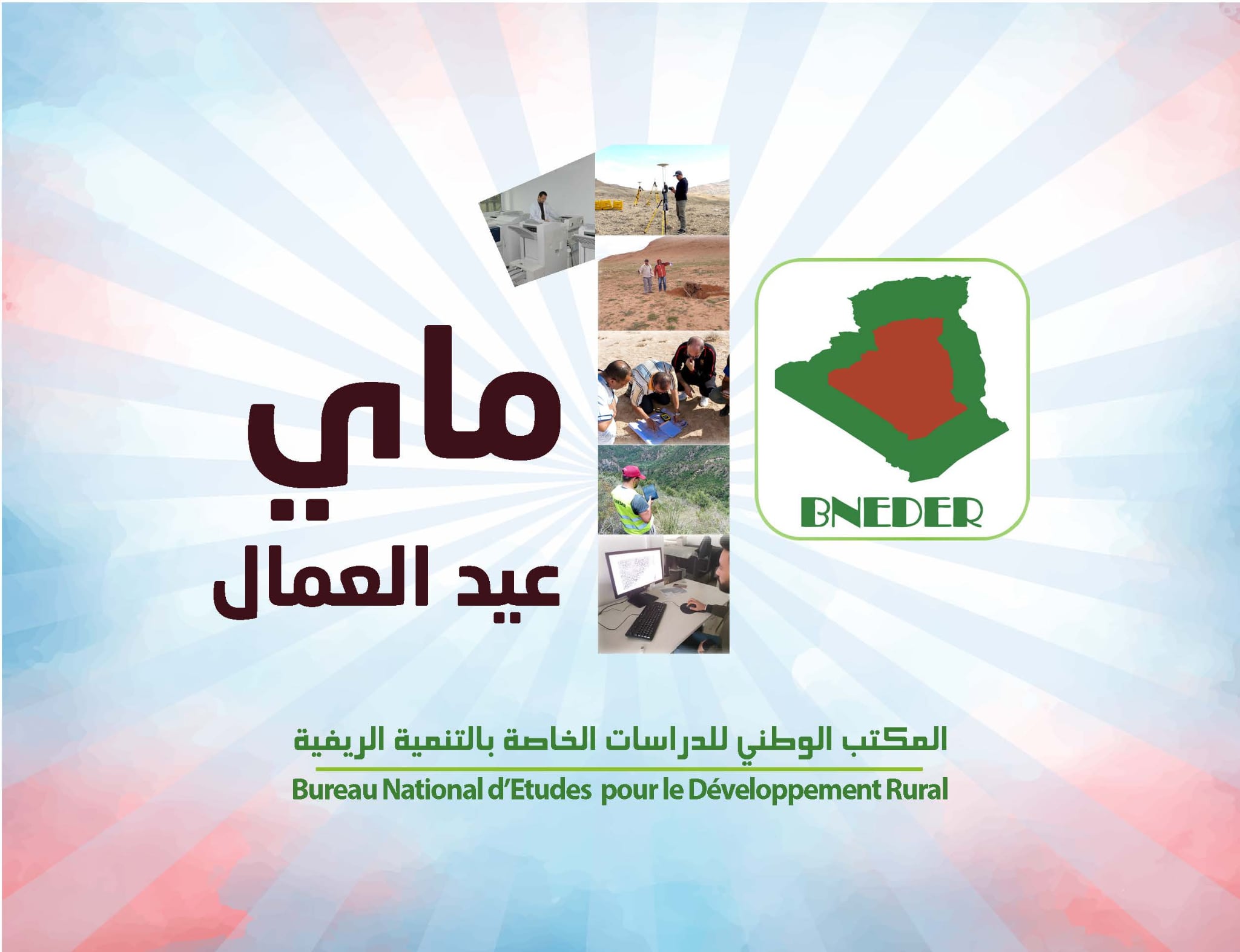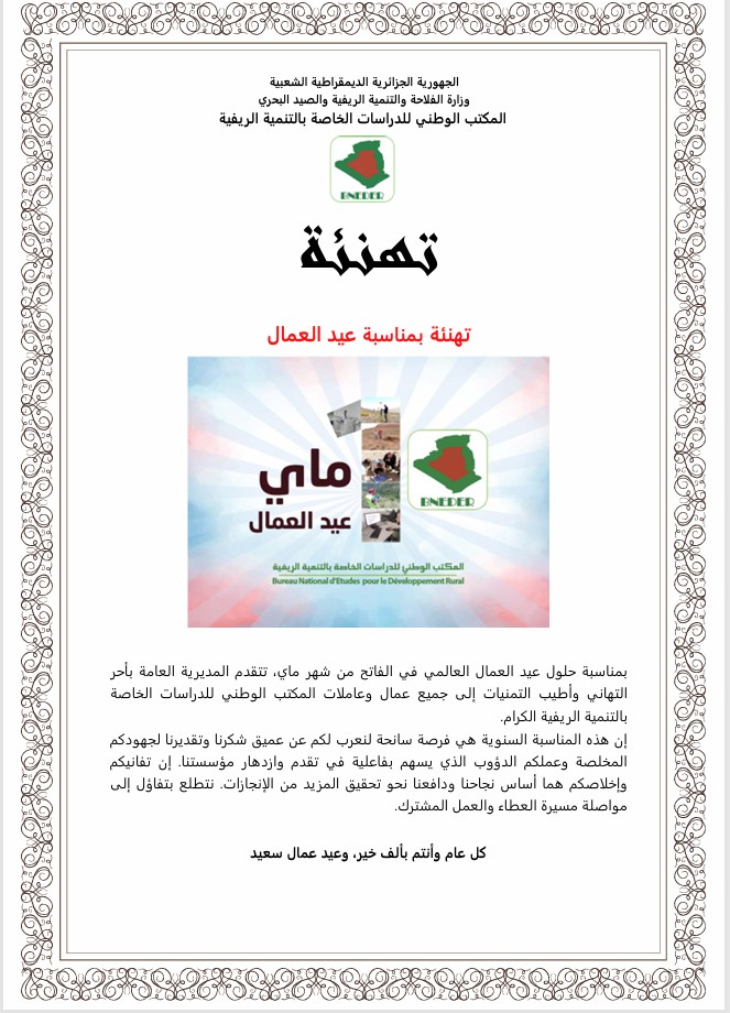 بمناسبة حلول عيد العمال العالمي في الفاتح من شهر ماي، تتقدم المديرية العامة بأحر التهاني وأطيب التمنيات إلى جميع عمال وعاملات المكتب الوطني للدراسات الخاصة بالتنمية الريفية الكرام.