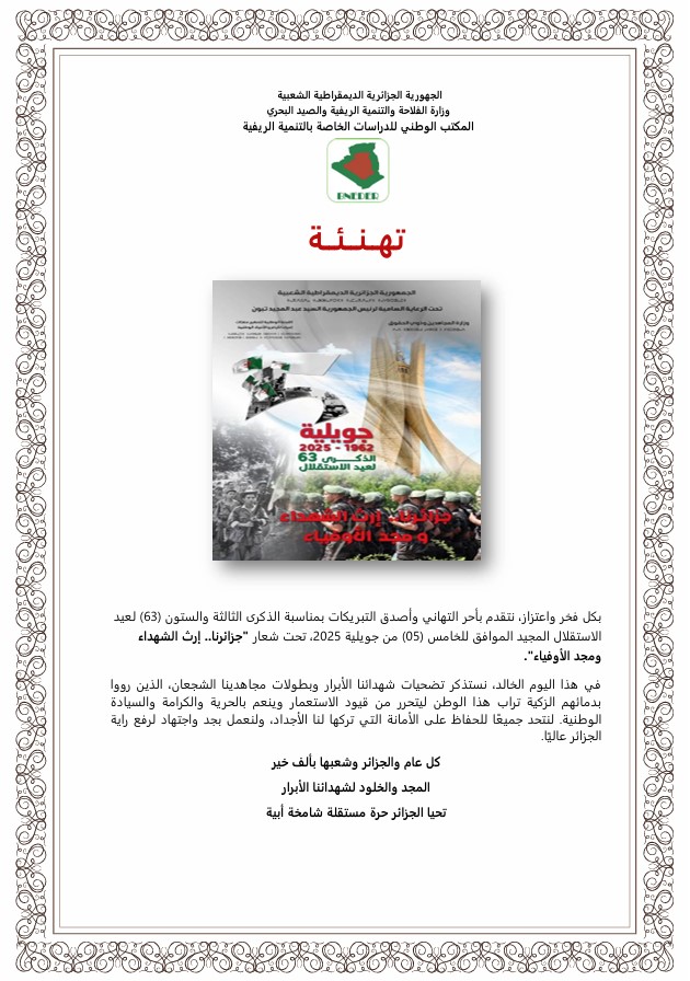 Previous Next 63e anniversaire de l'Independence Posté par admin le 03-07-2025 الذكرى 63 لعيد الاستقلال الوطني Événement Partager: